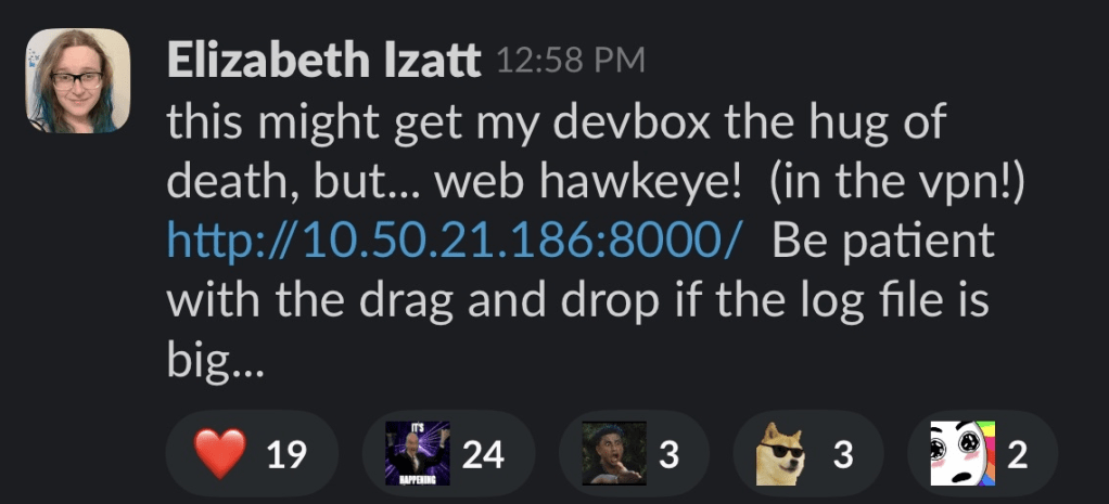 Before deploying to hawkeye.flyzipline.com, I let people try it hosted by my devbox… this did not go horribly wrong somehow