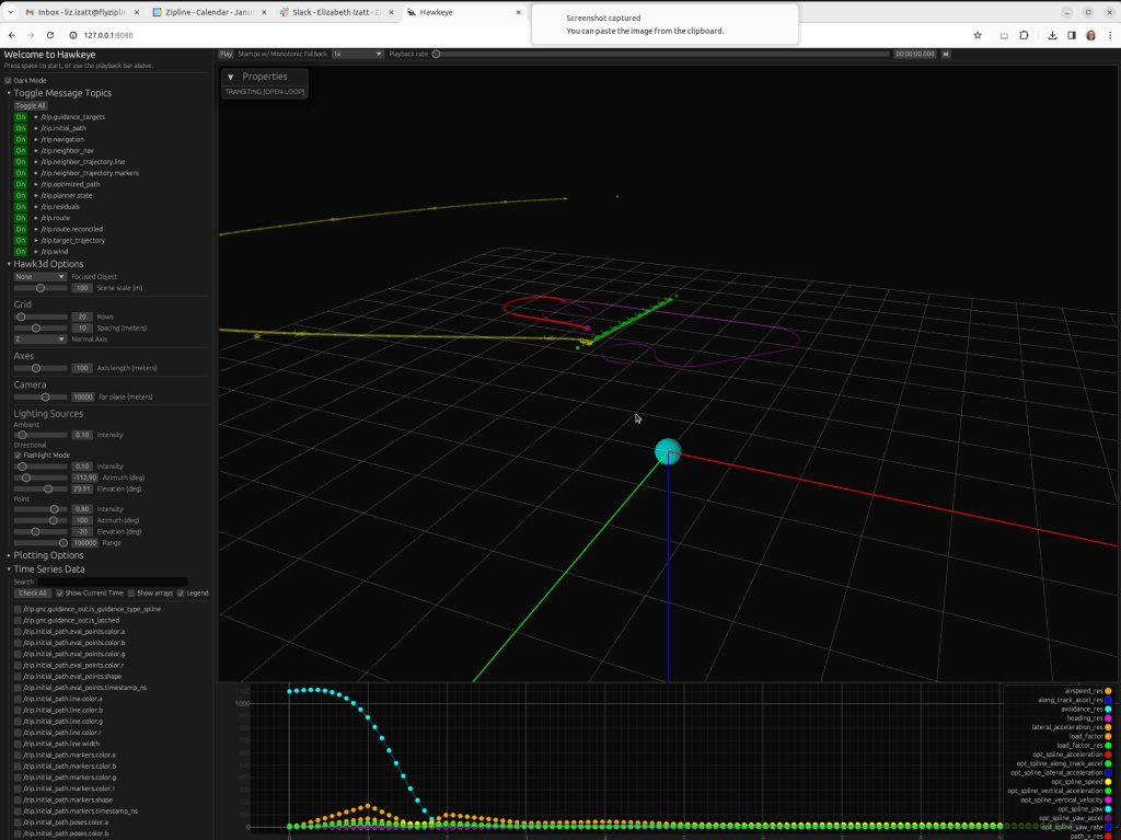 At Zipline, in addition to contributing to the simulation team’s integration efforts I became an owner of the Hawkeye visualization application. It was written in Rust, integrating with some of the same libraries as flight code, and run with cargo natively. It depended on marker messages being present in the IPC logs it visualized for each object to be rendered, similar to Xviz, thus necessitating that either flight code or the simulator or a postprocessing script add those marker messages to the logs. The original creators of Hawkeye, the GNC team, had a postprocessing script as part of their pipeline so this worked naturally for them. But ultimately more people wanted to use it, at the same time the simulator my team was responsible for was gaining traction.